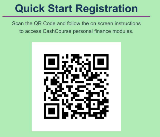 Just scan the QR code below or visit https://cashcourse.org and enter this 4 digit access code to register: